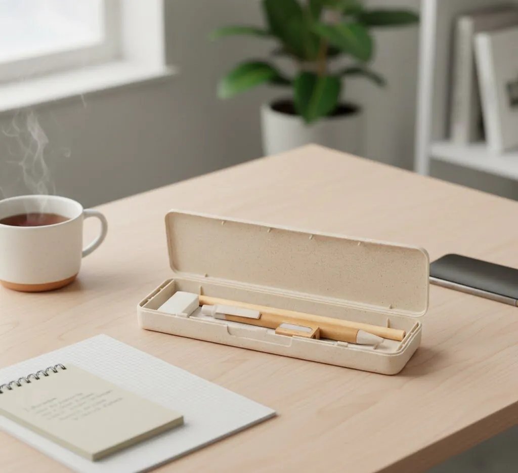 - Kit de escritura sostenible: lápiz de madera, bolígrafo de cartón reciclado, regla, sacapuntas, goma y estuche de caña de trigo.