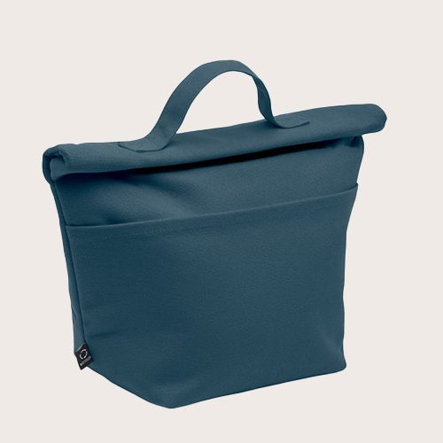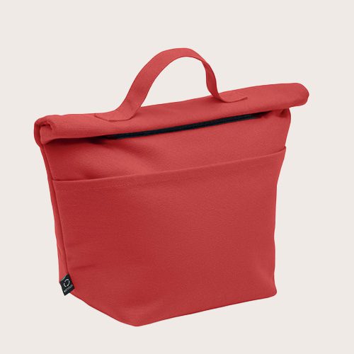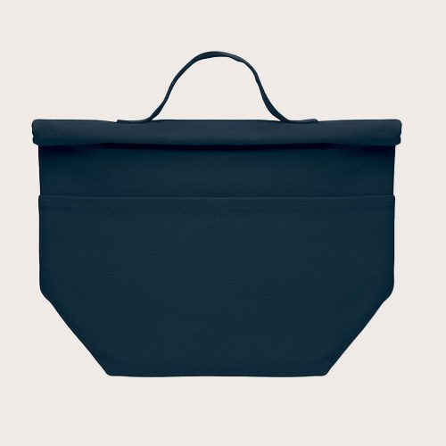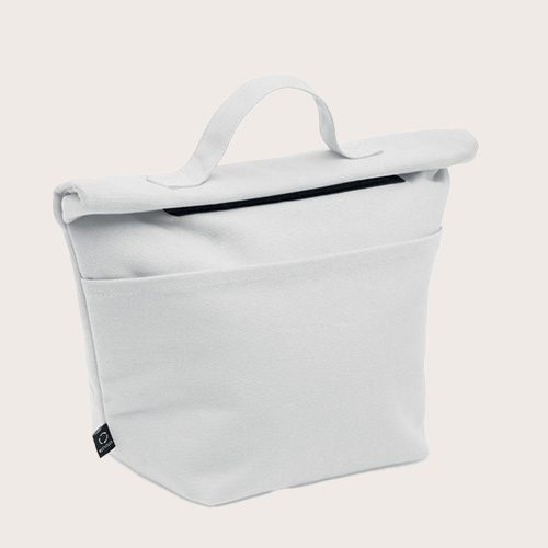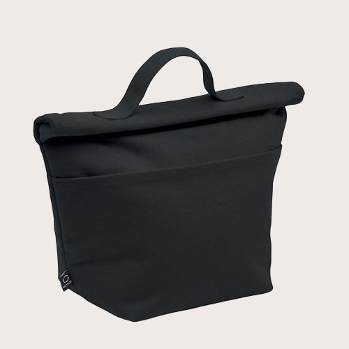 Bolsa nevera de algodón reciclado con cierre rolltop de gancho. Aislamiento de espuma de PE de 3 mm con PEVA de 12C.