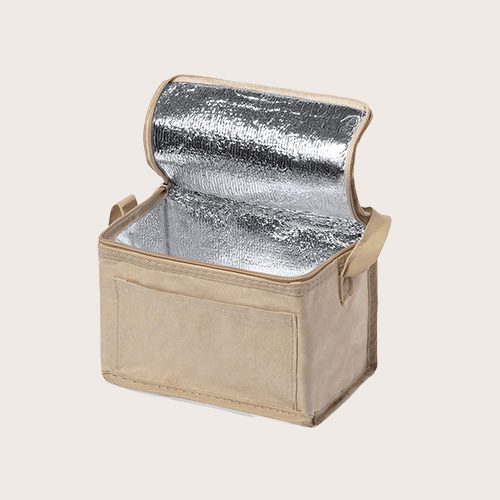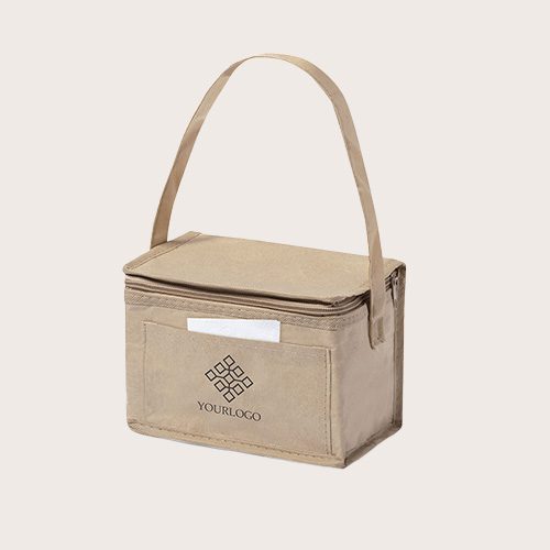 Nevera con capacidad para 6 latas. Fabricada en papel laminado resistente a la humedad, con interior isotermo acabado en aluminio. Cremallera y asa de transporte a juego, con bolsillo exterior para marcaje.