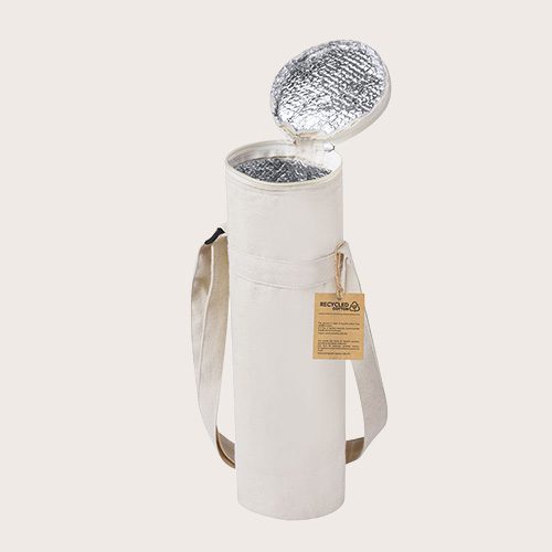 Bolsa térmica diseñada para transportar botellas de hasta 1,5L, confeccionada en algodón reciclado. Se cierra mediante una cremallera y se lleva cómodamente con la cinta para el hombro ajustable, en tono natural. El interior está forrado con material isotérmico de aluminio y cuenta con una etiqueta distintiva. Presentado individualmente en bolsa reciclada.