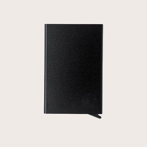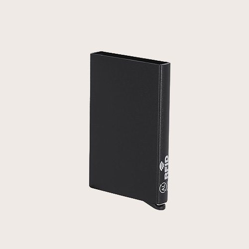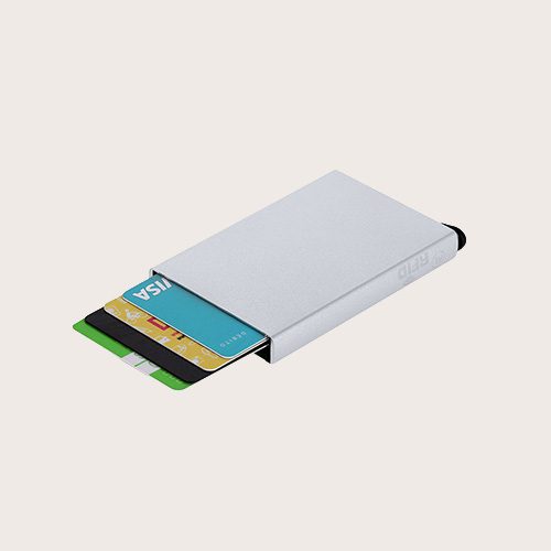 Tarjetero fabricado en aluminio reciclado. Capacidad hasta 10 tarjetas, con ingenioso mecanismo desliza y extrae de acceso a las tarjetas. Tecnología de seguridad RFID (Identificación por Radio Frecuencia) que mantiene seguros tus dispositivos de transmisión de identidad. Distintivos RFID y aluminio reciclado. Certificación GRS (Global Recycled Standard / Estándar de Reciclaje Global), que garantiza el origen reciclado del material usado para fabricar el producto.