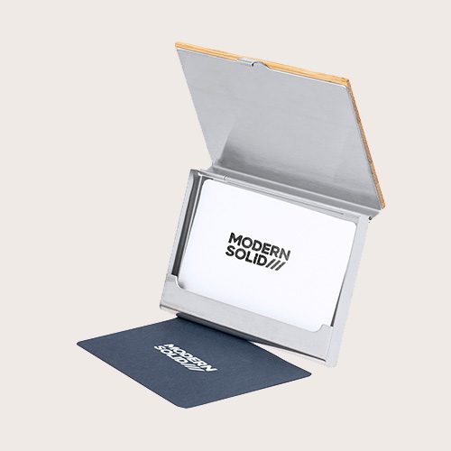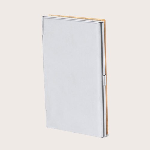 Elegante tarjetero fabricado en suave bambú, con tapas duras y cierre de presión. Destaca el detalle de bambú en la parte frontal y cuenta con un compartimento interior para almacenar tarjetas.