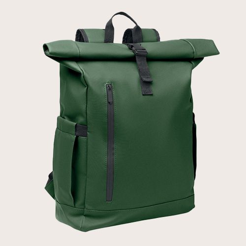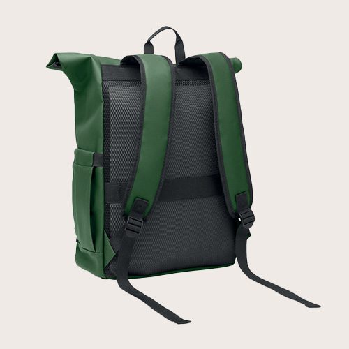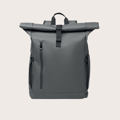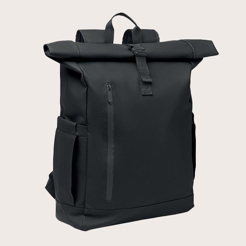 Mochila con cierre rolltop para portátil de 15″ en RPET 600D revestido de PU y forro de poliéster RPET. Espalda acolchada con malla, bolsillo con cremallera y correa para trolley. Bandolera acolchada con acabado interior de malla.