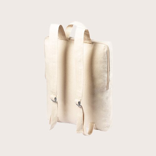 Mochila en suave algodón orgánico de color natural. Con bolsillo frontal de cremallera, asa de transporte y cintas para hombros ajustables. Con distintivo organic en etiqueta lateral.