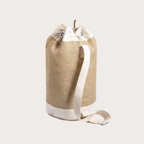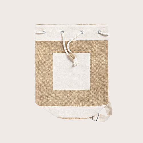 Petate multiusos con diseño bicolor. Fabricado en yute, con detalles en algodón. Con cinta ajustable y bolsillo interior. Compartimento principal con argollas metálicas reforzadas y bolsillo frontal para fácil marcaje.
