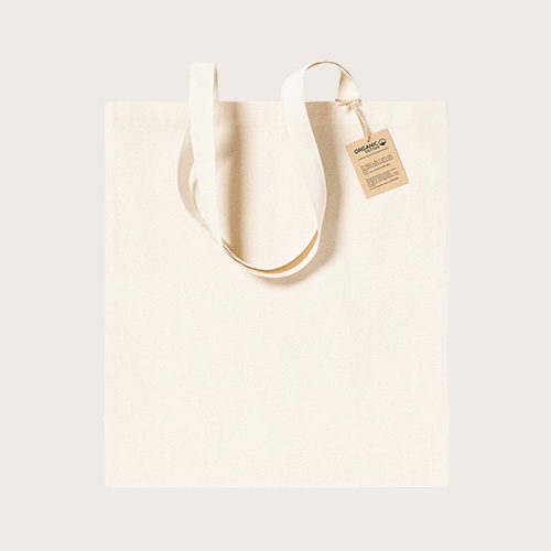 Bolsa fabricada principalmente en algodón orgánico de 140 g/m² y en tono natural. De acabado cosido, con asas medianas reforzadas de 70 cm. Resistencia hasta 8 kg, incluida etiqueta con distintivo de algodón orgánico y hangtag en cartón reciclado.