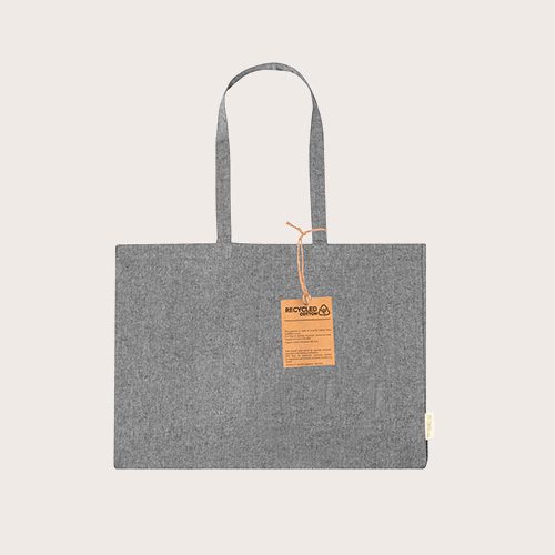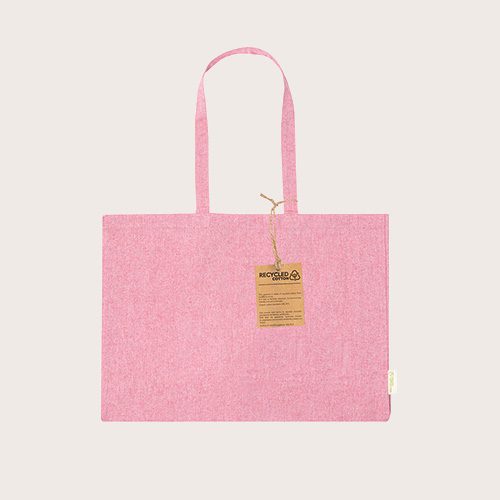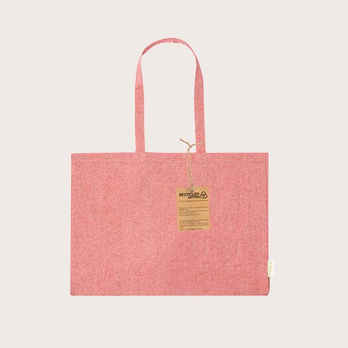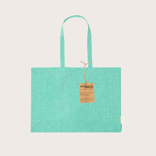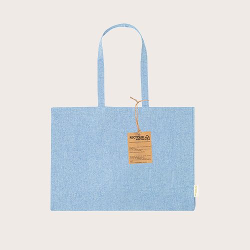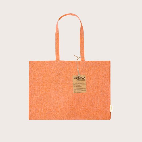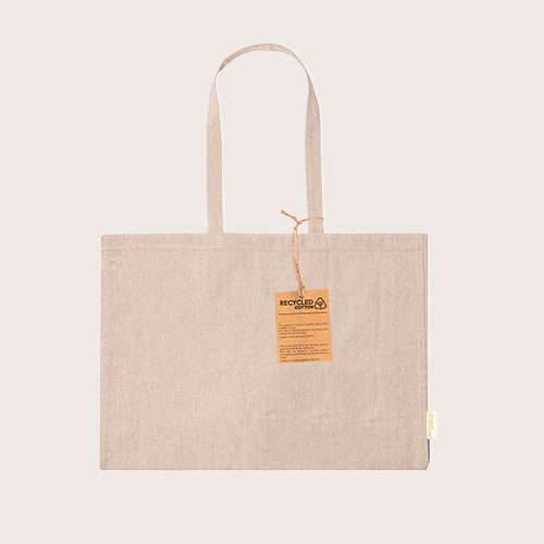 Bolsa fabricada en algodón reciclado de alto gramaje 220 g/m². De acabado cosido y con asas largas reforzadas. Con fuelle en base y laterales. Logotipo algodón reciclado en etiqueta exterior.