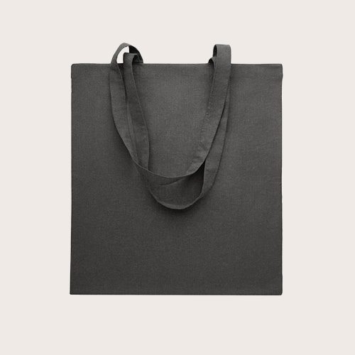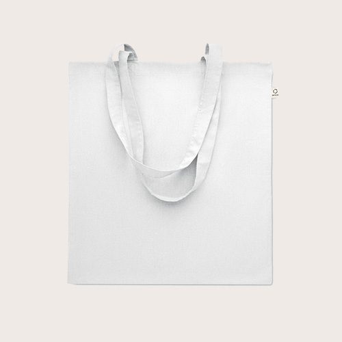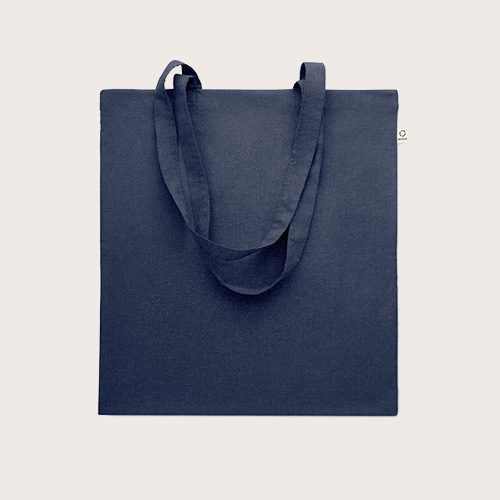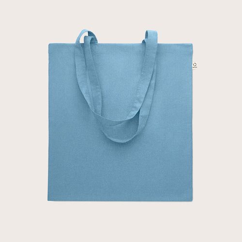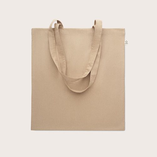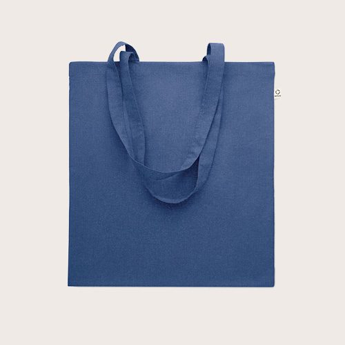 Bolsa de la compra de algodón reciclado pre-consumo (70% algodón reciclado y 30% RPET) con asas largas. Este artículo puede encogerse después de imprimir.