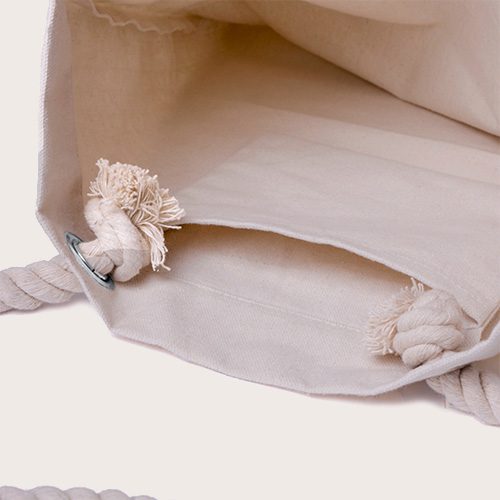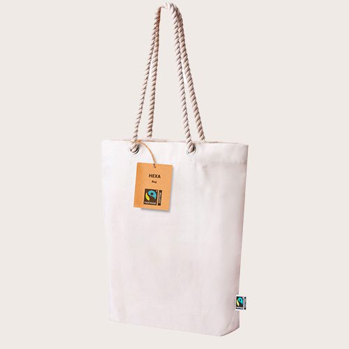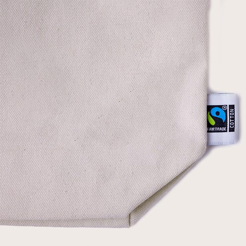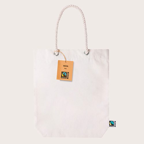 Bolsa fabricada principalmente en algodón de 280 g/m² de color natural. Con certificación Fairtrade (Comercio Justo) un sistema comercial solidario y alternativo al convencional que persigue el desarrollo de los pueblos y la lucha contra la pobreza. De acabado cosido, asas en forma de cuerda y argollas para mayor firmeza. Resistencia hasta 10kg de peso. Incluida etiqueta Fairtrade y etiqueta con logotipo en cartón reciclado.