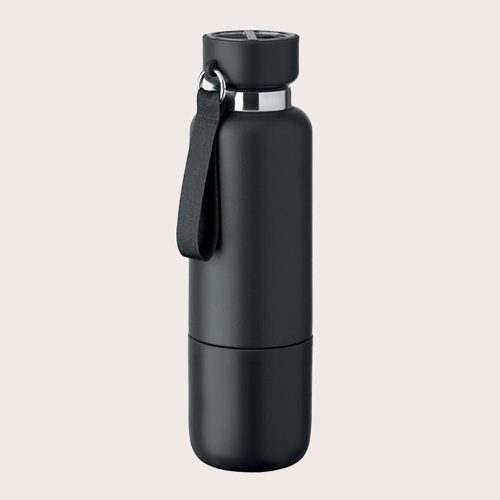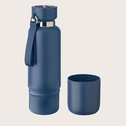 Botella isotérmica de doble pared en acero inoxidable reciclado al 90% y acero inoxidable al 10%, con asa de correa integrada y correa larga adicional (70 cm) en la tapa de PP.
