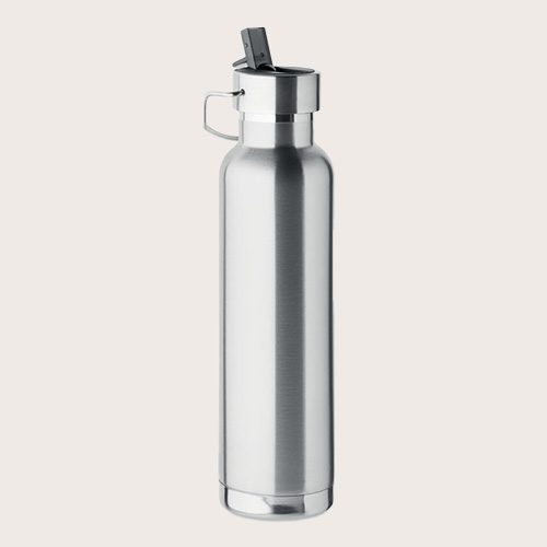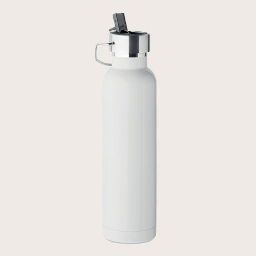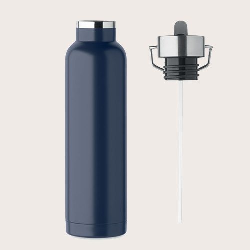 Botella aislante al vacío de doble pared de acero inoxidable reciclado (90% de acero inoxidable reciclado y 10% de acero inoxidable) con pajita incorporada y tapa con asa.