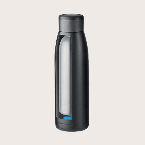Botella de acero inoxidable reciclado doble pared (90% de acero inoxidable reciclado y 10% de acero inoxidable) tapa de silicona. Simplemente agitando la botella, la temperatura de la superficie cambia para calentarse o enfriarse, dependiendo del líquido que contenga.