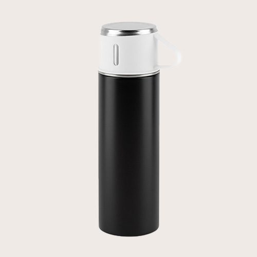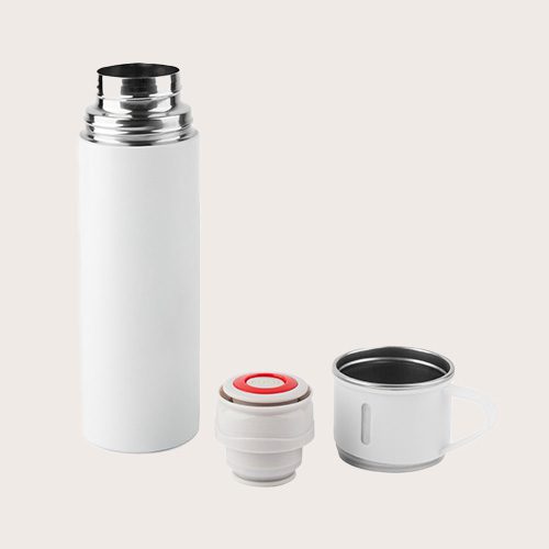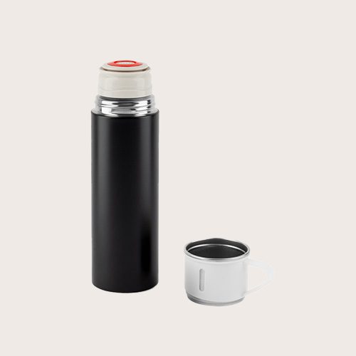Termo de acero inoxidable de doble pared (90% reciclado) con acabado mate. La tapa, también de acero inoxidable y con acabado mate frost, se puede transformar en un vaso con capacidad de hasta 140 ml.