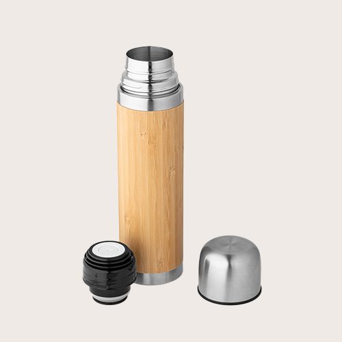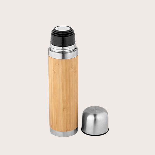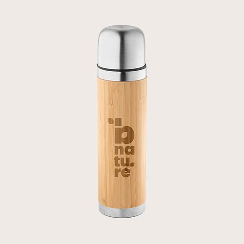 Termo de doble pared aislado al vacío de bambú y acero inoxidable. La botella tiene una capacidad de hasta 450 ml y mantiene las bebidas calientes durante 24 horas y frías durante 12 horas. Se suministra en caja de regalo de papel kraft. Como el producto está fabricado con materiales naturales, el color como el resultado de la impresión pueden variar entre unos y otros productos.