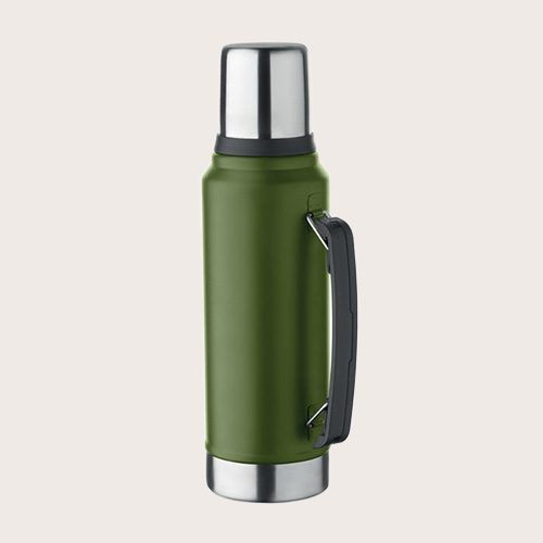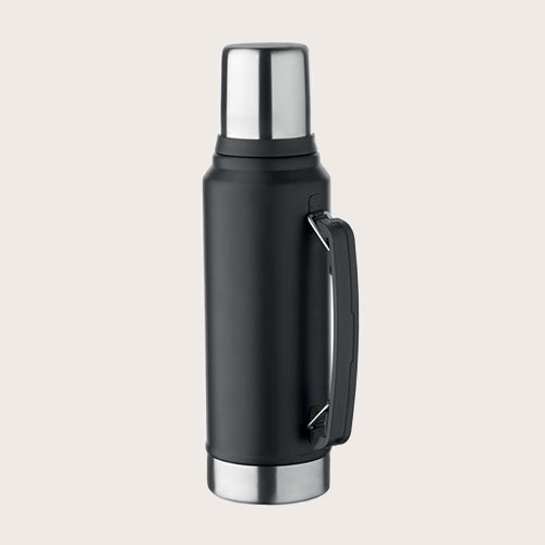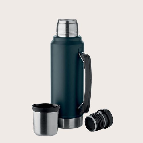 Termo de doble pared con aislante al vacío de acero inoxidable reciclado (90% de acero inoxidable reciclado y 10% de acero inoxidable) con asa lateral. Con tapa de PP y vaso de acero inoxidable reciclado.