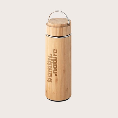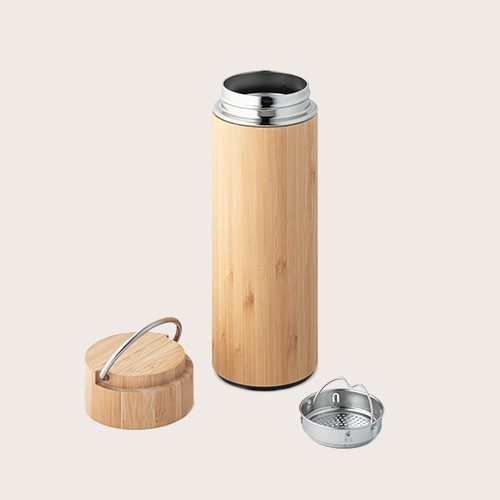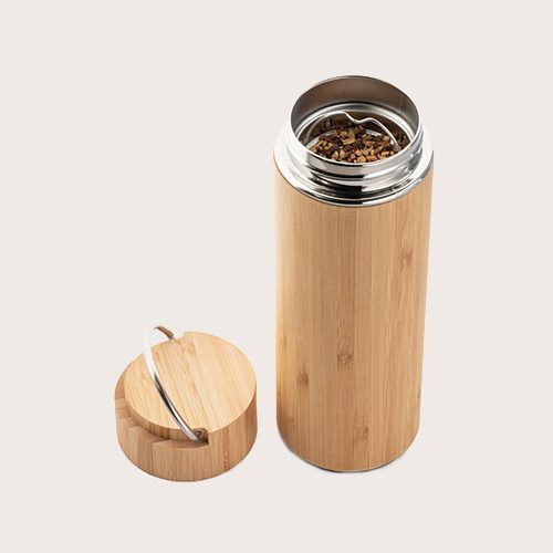 Termo de bambú y acero inoxidable con doble cuerpo al vacío e infusor de té. Esta botella tiene una capacidad de hasta 440 mL y se suministra en caja de regalo de papel kraft. Como el producto está fabricado con materiales naturales, el color como el resultado de la impresión pueden variar entre unos y otros productos.