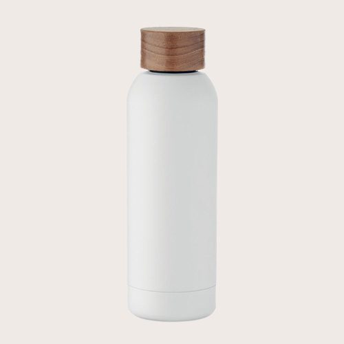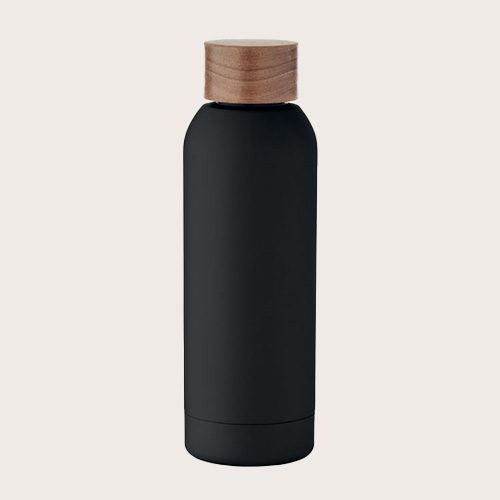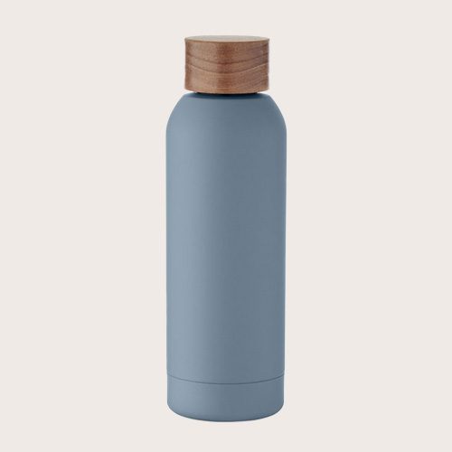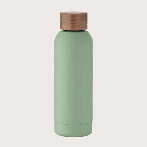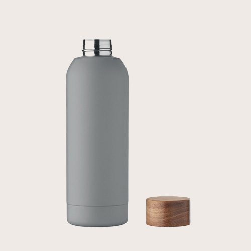 Botella de pared simple de acero inoxidable reciclado al 90% y acero inoxidable al 10% con acabado de caucho y tapa de madera de acacia. Al tratarse de una botella de pared simple, puede producirse transferencia de calor.