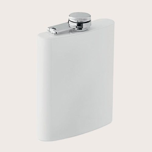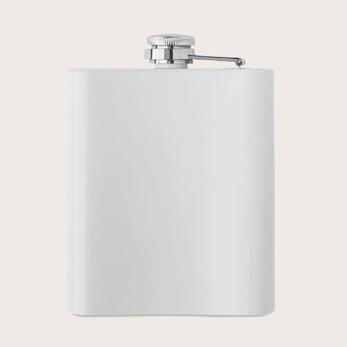Petaca de acero inoxidable reciclado (90% de acero inoxidable reciclado y 10% de acero inoxidable) con recubrimiento apto para la impresión en sublimación. Pared simple. Como se trata de una petaca de una sola pared, puede haber transferencia de calor.