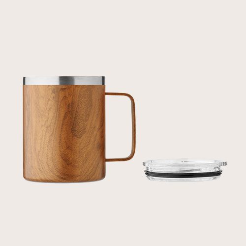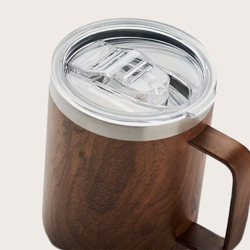 Taza de doble pared de acero inoxidable reciclado (90% acero inoxidable reciclado y 10% acero inoxidable) con aspecto de madera y tapa con orificio deslizante.