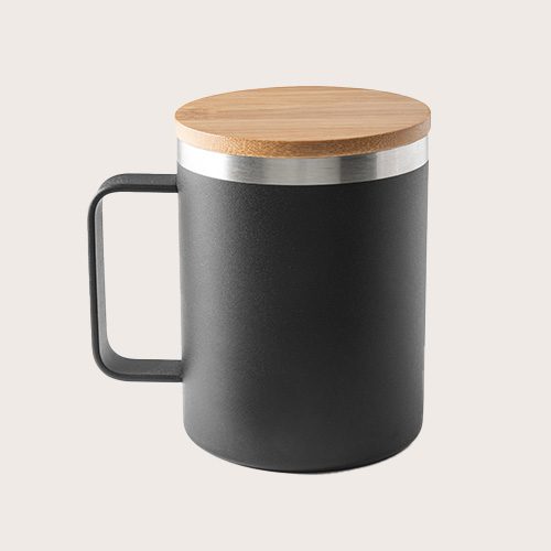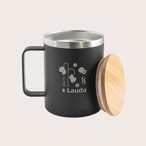 Taza en acero inoxidable (90% reciclado) con tapa de bambú y doble pared aislada, al vacío. Esta taza tiene un recubrimiento en polvo que la hace más duradera y resistente. Se entrega en una caja de regalo Kraft. Como el producto está fabricado con materiales naturales, el color como el resultado de la impresión pueden variar entre unos y otros productos.