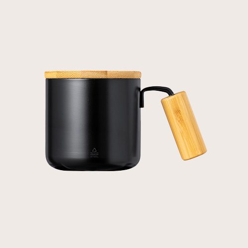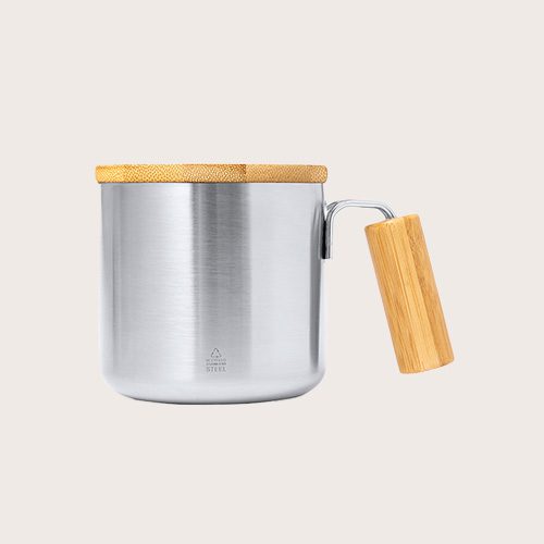 Original taza térmica de doble pared y 330 ml de capacidad. Fabricada en acero inoxidable reciclado, con tapa de bambú y asa de cómodo agarre a juego. Con distintivo acero inoxidable reciclado.