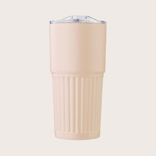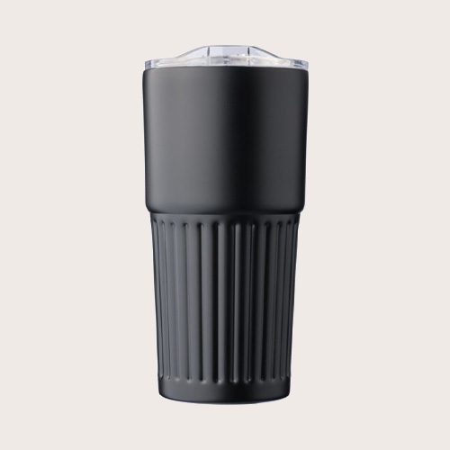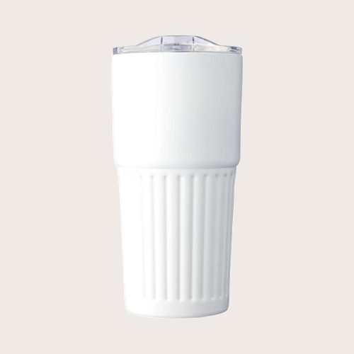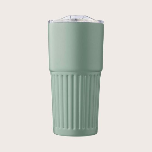 Vaso termo de acero inoxidable reciclado (500 ml). Interior acero inoxidable 304 y exterior acero inoxidable 201 con asa acanalada. Tapa de AS con cierre deslizante. Logotipo reciclado grabado en el cuerpo. Presentado en una caja de cartón marrón. Antifugas.