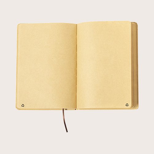 Bloc de notas A5, con tapas duras en resistente cartón reciclado. De 100 hojas lisas en acabado kraft con distintivo reciclado, con elástico de sujeción y marcapáginas de tela a juego.