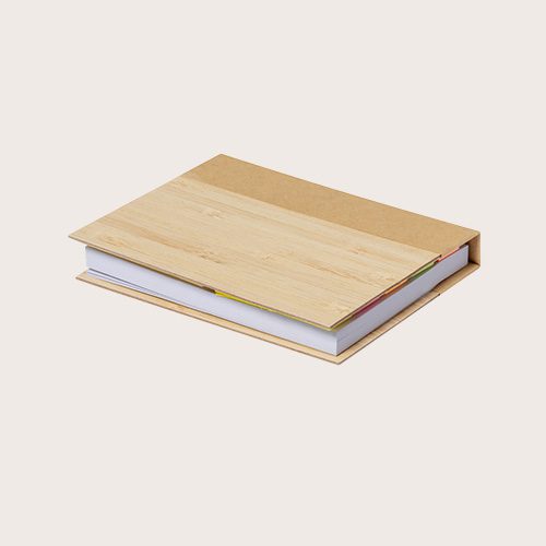 Bloc de notas de 70 hojas con tapas rígidas de bambú. Interior con 25 notas adhesivas 7.5 x 5cm y 125 mininotas adhesivas de 4.5 x 1.2cm en 5 colores diferentes.