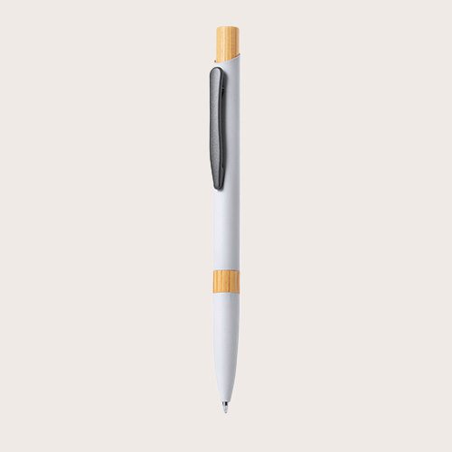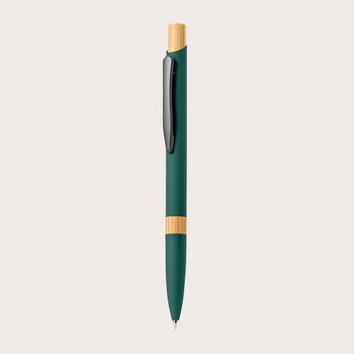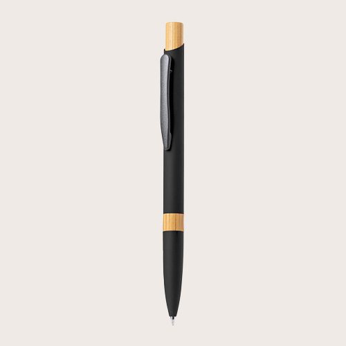 Elegante bolígrafo de aluminio con mecanismo pulsador. Cuerpo en resistente aluminio de acabado goma mate y con detalles en bambú, con caña en una amplia gama de distintivos colores. Clip metálico, de carga jumbo y en tinta azul.