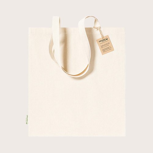 Bolsa fabricada principalmente en algodón orgánico de 180 g/m² y en tono natural. De acabado cosido, con asas medianas reforzadas de 70 cm. Resistencia hasta 8 kg, incluida etiqueta con distintivo de algodón orgánico y hangtag en cartón reciclado.
