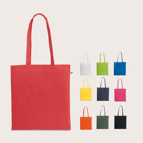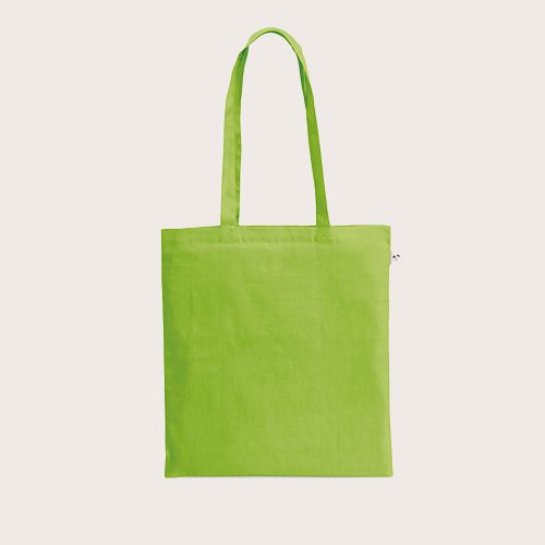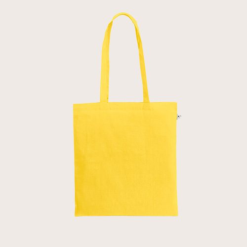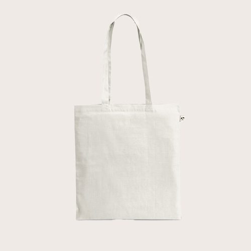 Bolsa fabricada en algodón reciclado (70%) y poliéster (30% rPET) (150 g/m²), con asas de 65 cm. El algodón reciclado es de color sólido y sin teñir. La materia prima se utiliza en su forma y color original, sin uso de productos químicos colorantes o blanqueadores, contribuyendo a un menor impacto. El color sólido se obtiene eligiendo hilo reciclado del mismo tono, pudiendo aparecer impurezas y variaciones de color.