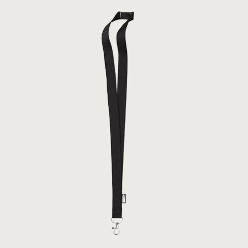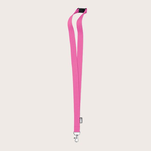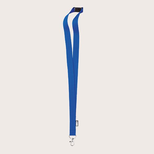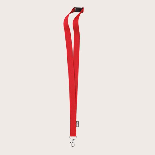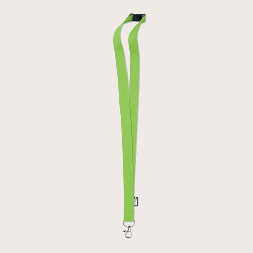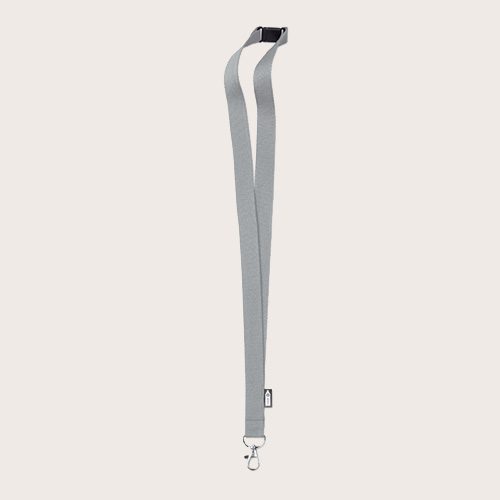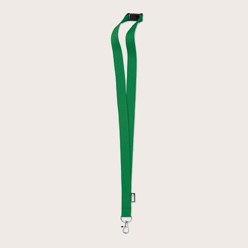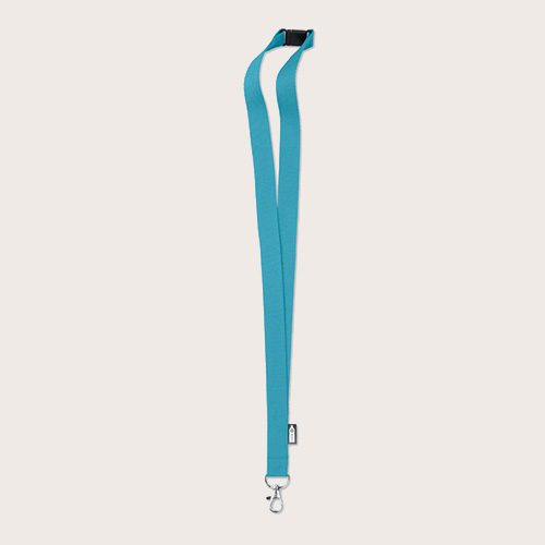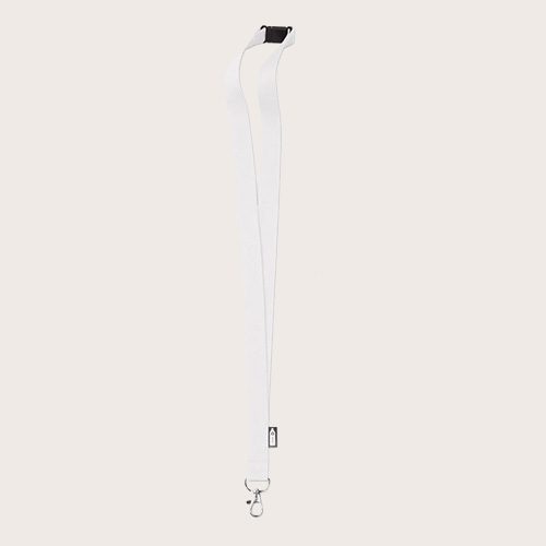 Lanyard de RPET de 20 mm con mosquetón metálico y cierre de seguridad. Impresión en Sublimación solo disponible sobre el artículo de color blanco.