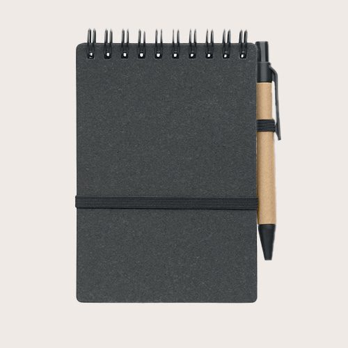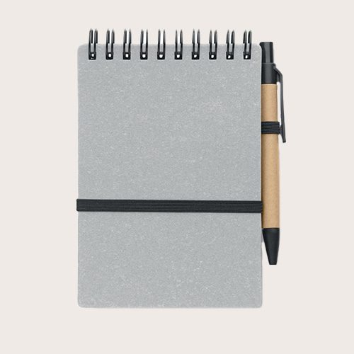 Libreta de papel reciclado y tapa de PU (70% papel reciclado y 30% PU) . Doble hilo. 140 páginas de papel reciclado rayado (70 hojas). Bolígrafo con pulsador a juego en cartón reciclado y ABS.