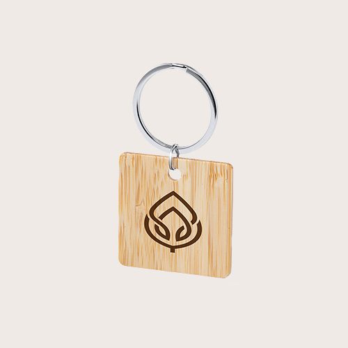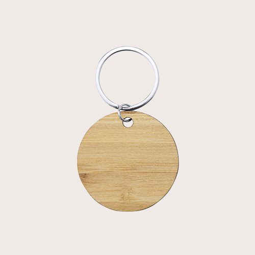 Llavero fabricado en bambú, disponible en diseños circular, cuadrado y rectangular.