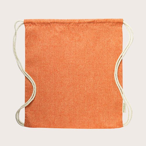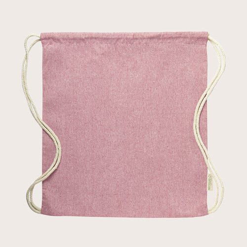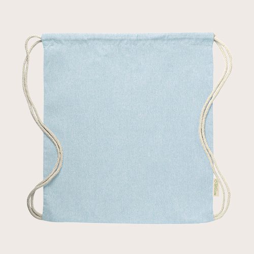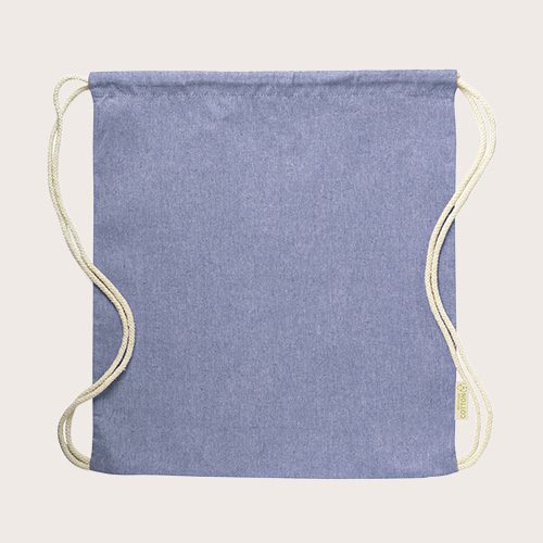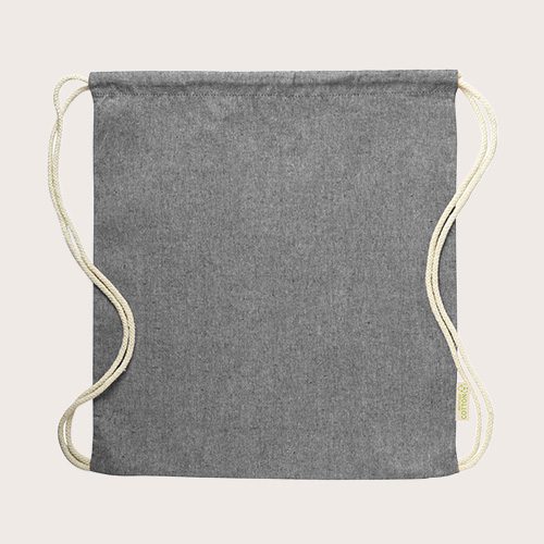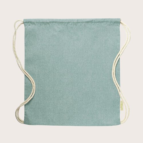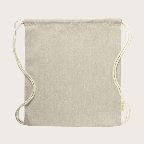 Mochila de cuerdas en algodón reciclado de 120 g/m². Cuerdas autocierre en algodón, con distintivo eco en etiqueta lateral y disponible en variada gama de colores.