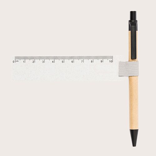 Original regla marcapáginas hecho en caña de trigo. Práctico utensilio de medida de hasta 10cm con pestaña para usar como marcapáginas y goma elástica para sujetar bolígrafos. Fabricado en caña de trigo y poliéster.