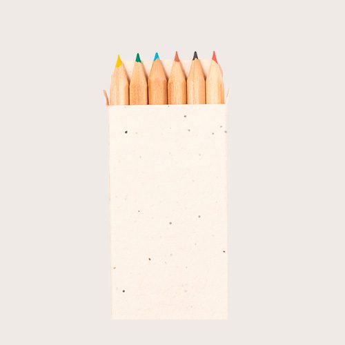 Set de 6 lápices en caja de cartón natural con semillas. Lápices de madera con cuerpo hexagonal de acabado natural y minas en variada gama de colores. Incluye semillas de petunia en la caja, convirtiéndolo así en cartón plantable al final de su vida útil. Flores en colores surtidos, con instrucciones de plantado en la cubierta trasera.