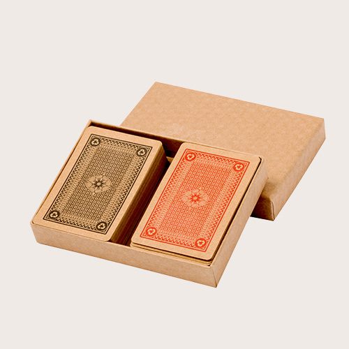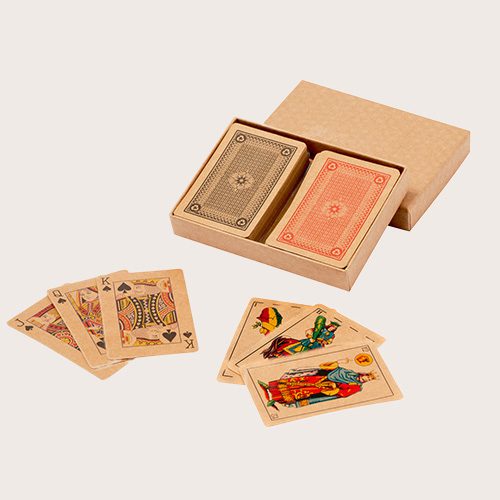 Set de baraja española y baraja francesa, fabricadas en resistente cartón reciclado. Baraja española con 50 naipes y baraja francesa con 54 naipes, presentadas en estuche de cartón acabado kraft con tapadera.