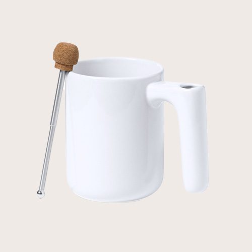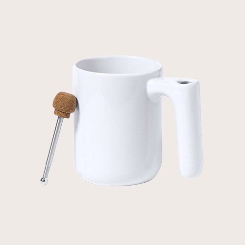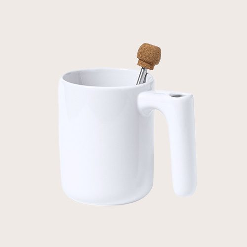 Taza de cerámica de 500 ml de capacidad, con exterior acabado brillo. Con original agitador extensible integrado en el asa, fabricado en combinación de acero inoxidable y corcho. Presentada en caja individual de diseño kraft.