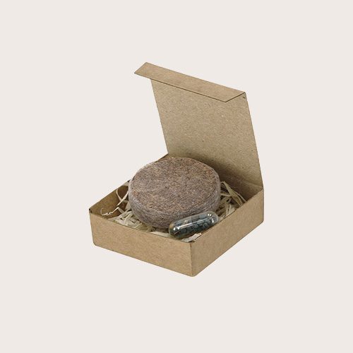 Pack plantable con cápsula de semillas y pastilla de sustrato, presentado en estuche de cartón reciclado con instrucciones de plantado. Flores silvestres.