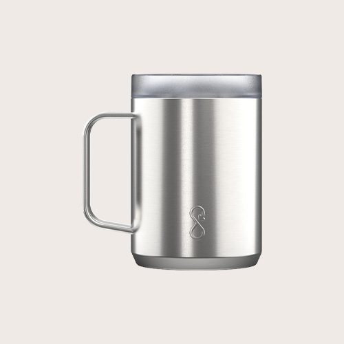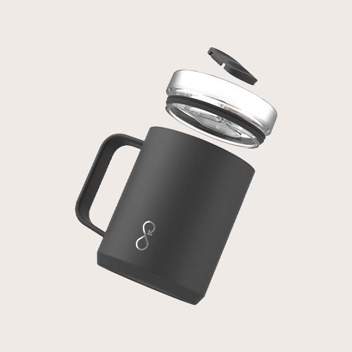 La taza de viaje «Ocean Bottle» de 350 ml tiene aislamiento doble para mantener las bebidas calientes durante cuatro horas y frías durante diez. El asa ergonómica permite sujetarla a bolsos u otros objetos para optimizar el espacio de almacenamiento y la capacidad de transporte. Cada taza de viaje es totalmente neutra en carbono y sirve para financiar la recogida de 1000 botellas de plástico para mejorar los medios de vida en las comunidades costeras. La taza está fabricada con un 90 % de acero inoxidable reciclado y otros materiales reciclados.