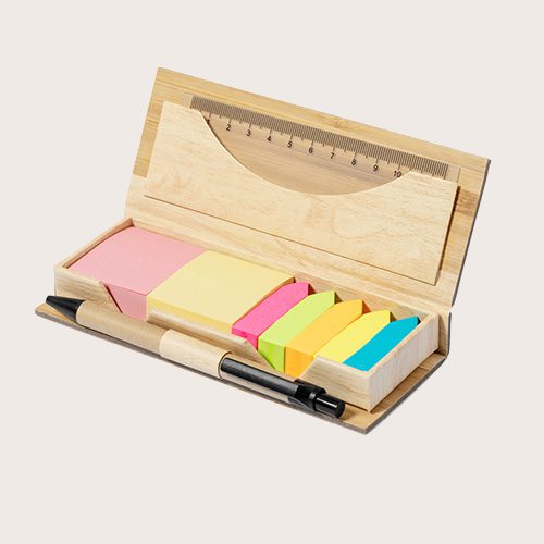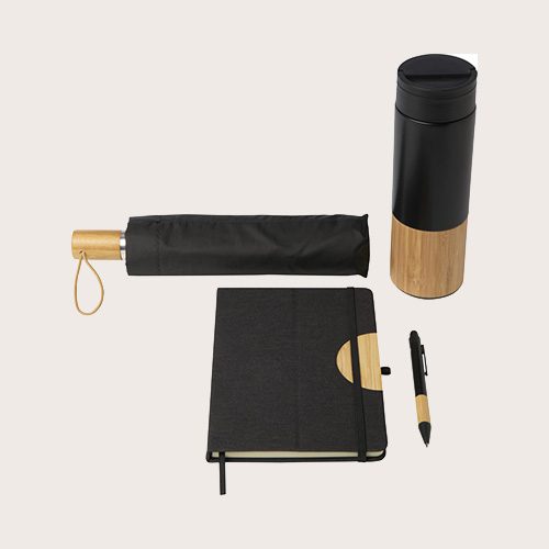 Set de regalo que incluye una libreta A5 de tapa dura con 80 hojas rayadas color crema (80 g/m²), cierre elástico negro, cinta marcapáginas y soporte para teléfono integrado con detalle de bambú; un bolígrafo de tinta negra; una botella de acero inoxidable de 450 ml con base de bambú (lavado a mano); y un paraguas de 21″ con cubierta de tafetán negro, eje metálico, varillas de fibra de vidrio y mango de bambú.