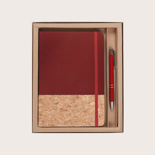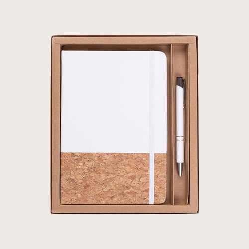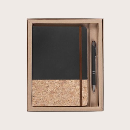 Conjunto de libreta con detalle de corcho y bolígrafo con acabado de caucho, presentado en caja de cartón kraft.