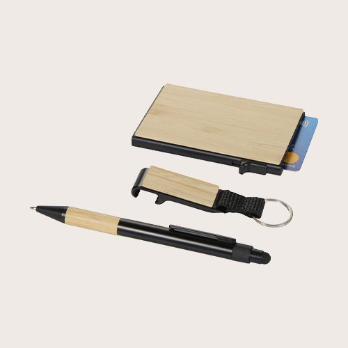 El set de regalo incluye un bolígrafo de aluminio reciclado con certificación RCS, una elegante empuñadura de bambú y punta de stylus, un llavero de aluminio (5,5 × 1,8 × 1 cm) con detalles de bambú y un soporte para teléfono integrado, así como un tarjetero RFID (9,7 × 6,2 × 1 cm) con cuerpo de aleación de aluminio y detalles de bambú, que ofrece protección para hasta 10 tarjetas. El bolígrafo contiene tinta negra, con una longitud de escritura de 1000 metros. Un regalo práctico y bien pensado que combina funcionalidad con un diseño moderno. Se entrega en una caja de regalo negra de primera calidad (16 × 16 × 2,7 cm) con una parte frontal lisa, ideal para añadir un logotipo.
