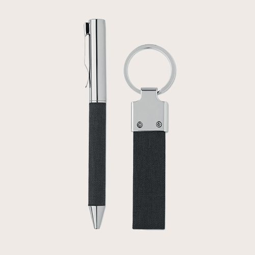 Set de regalo de 2 piezas en caja de regalo. Incluye bolígrafo metálico con detalle de poliéster RPET y llavero de poliéster RPET.
