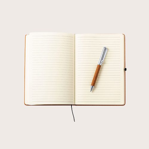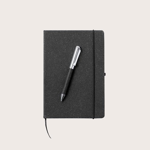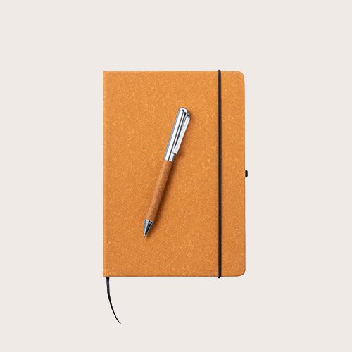 Bloc de notas con tapas rígidas fabricadas en cuero reciclado. Interior con 100 hojas de disposición a una raya. Incluye marcapáginas, elástico de cierre y soporte para bolígrafo a juego. Con distintivo cuero reciclado en contraportada. Set presentado en estuche individual de diseño kraft, con compartimento independiente para bloc de notas y bolígrafo.