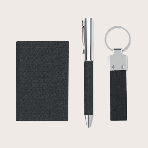 Set de regalo de 3 piezas en caja de regalo. Incluye bolígrafo metálico con detalle de poliéster RPET, llavero de poliéster RPET y tarjetero de poliéster RPET con placa metálica.