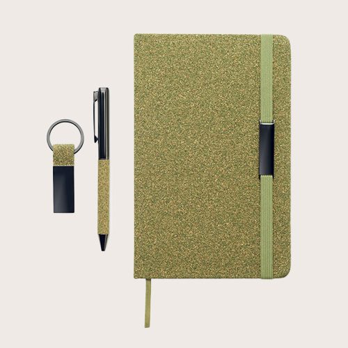 Set de libreta A5 de tapa dura y 160 páginas de papel reciclado rayado (80 hojas/70 g/m²) , bolígrafo metálico giratorio y llavero. Detalle fabricado con un 20% de posos de té, un 30% de corcho y un 50% de tela de poli algodón. Detalle metálico en la correa elástica.