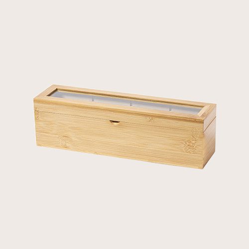 Caja para té fabricada en bambú, con cristal en tapa. Incluye 4 compartimentos para almacenar distintos tipos de té. Presentada en atractiva caja de diseño eco.