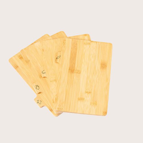 Conjunto de tablas de corte fabricadas en bambú, cada una fácilmente identificable por los dibujos tallados específicamente para pescado, carne blanca, carne roja y verduras. Incluye una cesta metálica con guías para un almacenamiento ordenado.